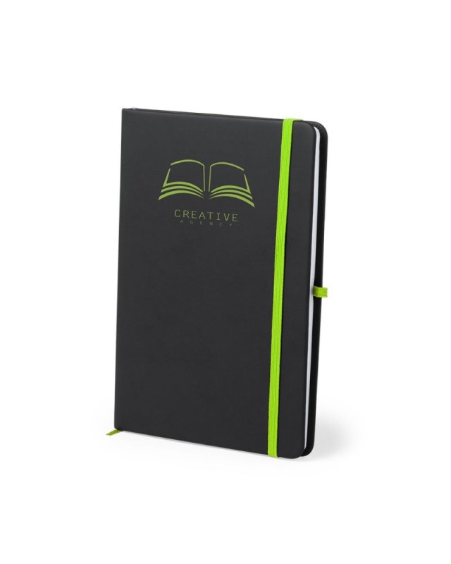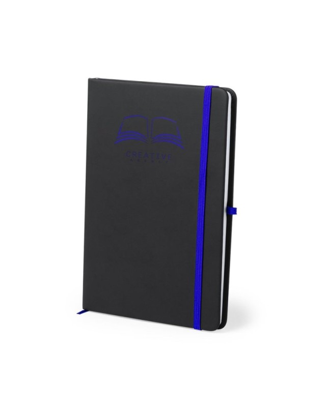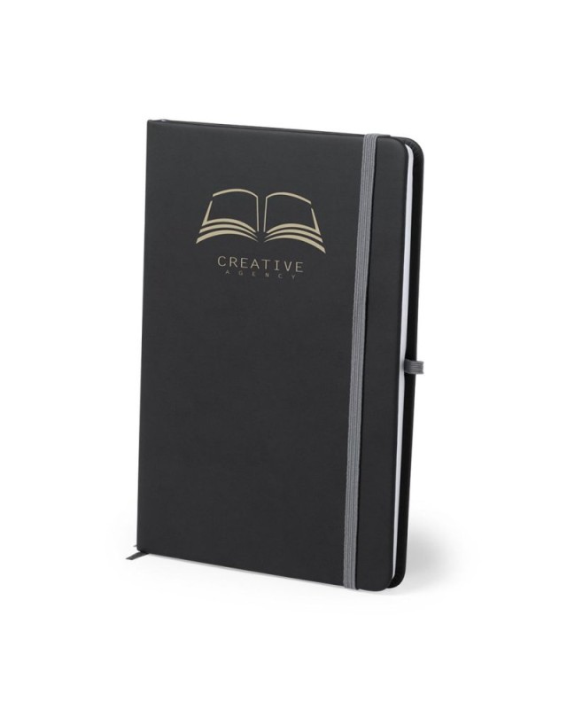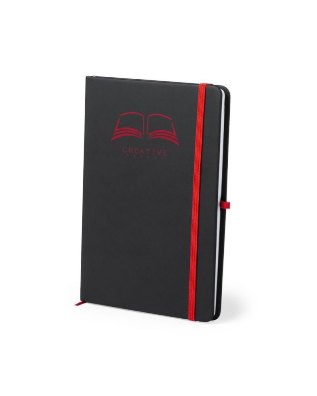 Block notes con copertina morbida al tatto e rifinita in similpelle. In elegante nero, con chiusura elastica, segnalibro e portapenne elastico in colori vivaci. Fodera esterna appositamente progettata per la stampa laser, in modo che la vostra pubblicità o il vostro marchio siano perfettamente incisi in un colore abbinato allarticolo. Include 100 fogli con layout a riga singola. - Lunghezza: 14.2 cm - Larghezza: 1.5 cm - Peso: 277 gr
