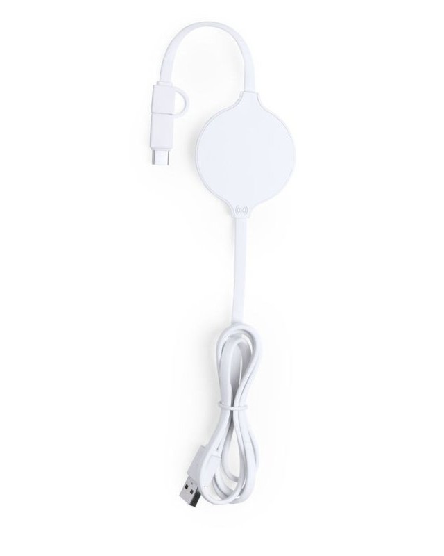 Caricatore wireless ultracompatto dal design monocromatico bianco. Doppia connessione micro USB e Lightning, con adattatore Type-C e indicatore luminoso di ricarica. Compatibile con i dispositivi dotati di tecnologia di ricarica wireless. - Lunghezza: 110 cm - Peso: 47 gr