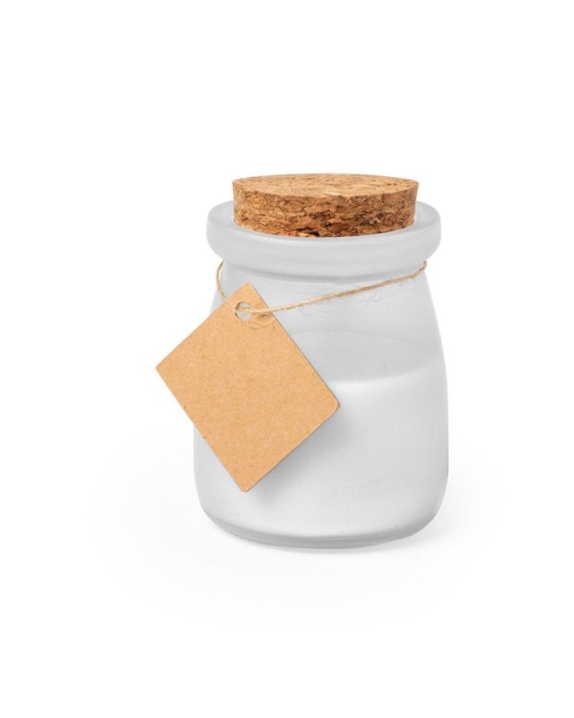 Originale candela in vasetto di vetro. Con tappo in sughero ed etichetta in cartone riciclato con filo per la messaggistica. Disponibile in vari colori e presentata singolarmente in una scatola bianca. - Diametro: 5.6 cm - Peso: 146 gr