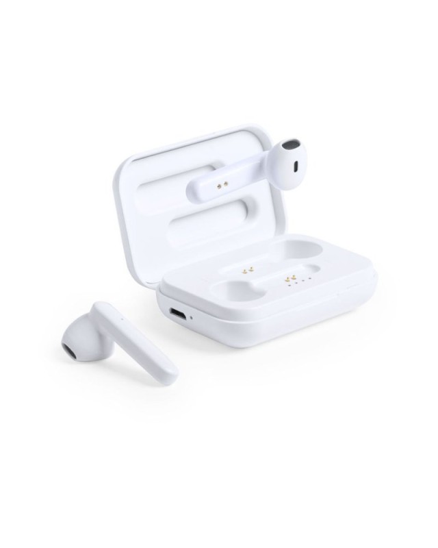 Cuffie in-ear con elegante finitura bianca e connessione Bluetooth 5.0. Design ergonomico, con pulsante di controllo a sfioramento integrato nellauricolare e base di ricarica abbinata. Funzione viva voce e ricaricabili, con cavo micro USB incluso. Presentate in una custodia individuale di lusso con coperchio incernierato e unattraente scatola di design. - Lunghezza: 4.5 cm - Larghezza: 2.2 cm - Peso: 38 gr