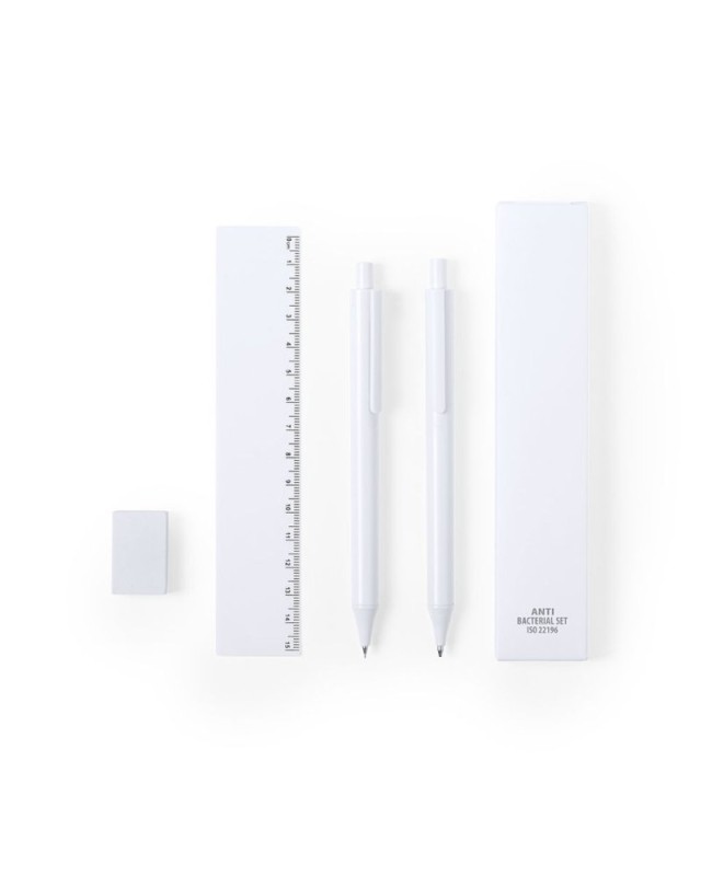 Set antibatterico in resistente materiale PP bianco. Include penna a sfera, matita meccanica (Mina da 0,5 mm inclusa), righello da 15 cm e gomma.I prodotti con trattamento antibatterico sono in grado di ridurre drasticamente la carica batterica presente sulla superficie dei materiali, grazie alla presenza di agenti microbici statici permanenti, con elevata efficacia nellinibire e prevenire la contaminazione batterica.Articolo rispondente agli standard ISO 22196, che determina lattività antibatterica nei materiali plastici e nelle superfici non porose e di conoscere lefficacia dellinibizione microbica che gli additivi hanno sugli oggetti trattati attraverso una valutazione quantitativa - Lunghezza: 3.4 cm - Larghezza: 1.5 cm - Peso: 40 gr