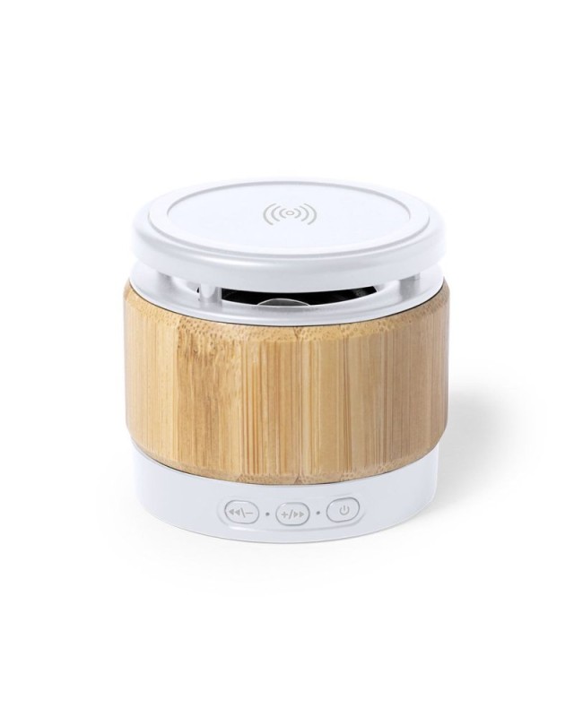 Altoparlante Bluetooth nature line con caricatore wireless integrato da 5W e design compatto. Realizzato in una combinazione di materiali in bambù e ABS, con unelegante finitura bicolore. Connessione Bluetooth 5.0 e 3W di potenza. Ricaricabile tramite cavo USB - 150 cm incluso - e confezionato in unattraente scatola dal design ecologico. Manuale distruzioni disponibile in spagnolo e inglese. - Diametro: 7.4 cm - Peso: 130 gr