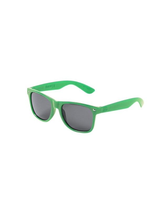 Occhiali da sole della linea Nature con protezione UV400. Telaio e stecche in RPET, realizzati in plastica riciclata per favorire il riutilizzo dei rifiuti plastici e contribuire alla sostenibilità del pianeta. Lenti AC (acetato di cellulosa) in nero, disponibili in unampia gamma di colori. Confezionati singolarmente in unattraente borsa di design ecologico. - Peso: 25 gr
