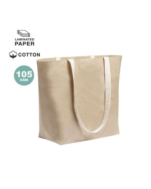 Shopper della linea Nature in carta laminata resistente di 105g/m2, altamente resistente. Manici lunghi in cotone di colore naturale. Finitura cucita e resistenza fino a 8 kg di peso. - Lunghezza: 48 cm - Larghezza: 15 cm - Peso: 62 gr