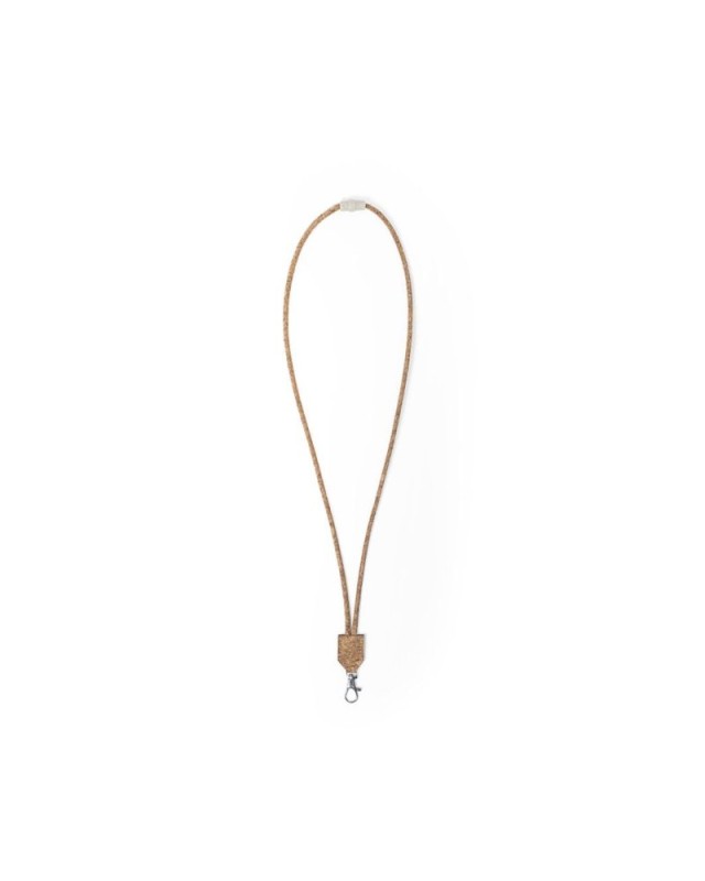 Lanyard della linea Nature in sughero naturale con finitura tubolare. Con chiusura di sicurezza a collare in fibra di grano / PP e moschettone in metallo. Include placca centrale in sughero per la stampa. - Lunghezza: 2 cm - Peso: 13 gr