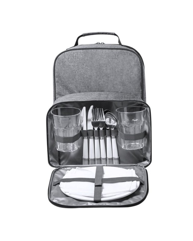 Zaino Frigo picnic della Linea Natura, realizzato in resistente RPET 600D di alta qualità, fatto con plastica riciclata per incoraggiare il riutilizzo dei rifiuti plastici e contribuire alla sostenibilità del pianeta. Ideale per 2 persone, con tasca separata per una conservazione sicura dei cibi. Include 2 bicchieri, 2 coltelli, 2 cucchiai, 2 forchette, 2 piatti e 2 tovaglioli. Scomparto frigo con interno in PEVA e comoda maniglia per il trasporto. Cinghie imbottite e schienale imbottito. RPET sulletichetta. - Lunghezza: 27 cm - Larghezza: 22 cm - Peso: 945 gr