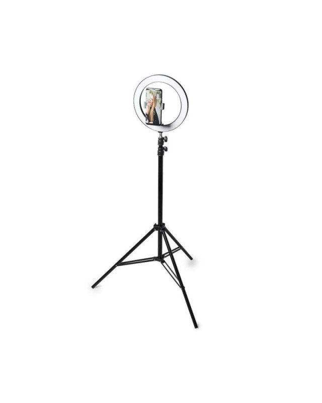 Set di luci. Include anello luminoso, treppiede da tavolo e treppiede da terra con altezza regolabile fino a 180 cm. 120 LED, con 3 posizioni di illuminazione e 10 livelli di intensità luminosa regolabili. Alimentato dalla connessione USB. Cavo con controller e telecomando incluso. Confezionato in una scatola dal design accattivante. - Lunghezza: 30 cm - Larghezza: 34.5 cm - Peso: 686 gr