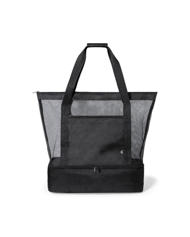 Borsa in resistente poliestere 600D RPET plastica riciclata per incoraggiare il riutilizzo dei rifiuti plastici e contribuire alla sostenibilità del pianeta. Scomparto principale in rete tipo mesh, con chiusura a zip. Borsa termica integrata nella base, in resistente poliestere 600D RPET, con interno isotermico in PEVA. Maniglie di trasporto rinforzate e grande tasca frontale, con etichetta RPET. - Lunghezza: 48 cm - Larghezza: 16.5 cm - Peso: 260 gr