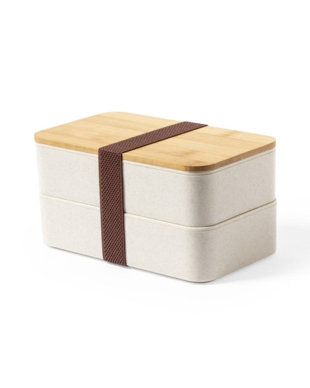 Porta pranzo da 1,4 l in robusto PP venato senza BPA, con coperchio in bambù. Due scompartimenti, ciascuno con una capacità di 700 ml. Scomparto interno con forchetta, cucchiaio e coltello. Include una cinghia di sicurezza esterna. Certificato Food Grade, che garantisce la sicurezza dellarticolo al contatto del cibo con il materiale utilizzato per la fabbricazione del prodotto. - Lunghezza: 18 cm - Larghezza: 10.6 cm - Peso: 408 gr