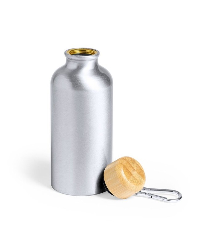 Borraccia della linea natura con capacità di 400 ml. Corpo in alluminio con finitura opaca e coperchio in bambù con moschettone in tinta per un facile trasporto. Senza BPA e presentata in unattraente scatola di eco-design. - Diametro: 6.6 cm - Peso: 72 gr