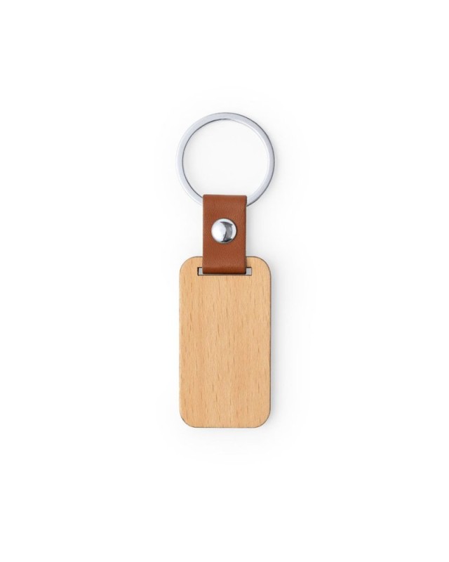 Portachiavi della linea natura in legno naturale, con cinturino originale in pelle PU marrone e rivetto cromato. Disponibile in versione rettangolare e circolare. - Peso: 10 gr