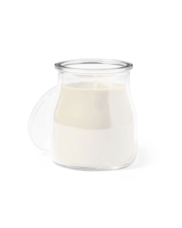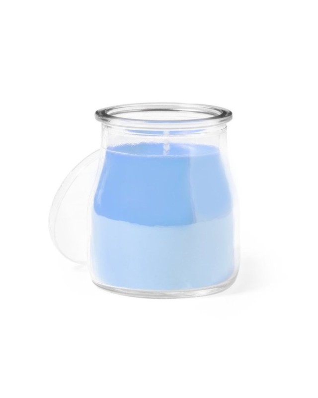 Candela profumata in vaso di vetro, disponibile in profumazioni assortite: vaniglia bianca, frutti di bosco rossi, blu oceano e verde muschio. Con logo Made In Europe. - Diametro: 6 cm - Peso: 200 gr