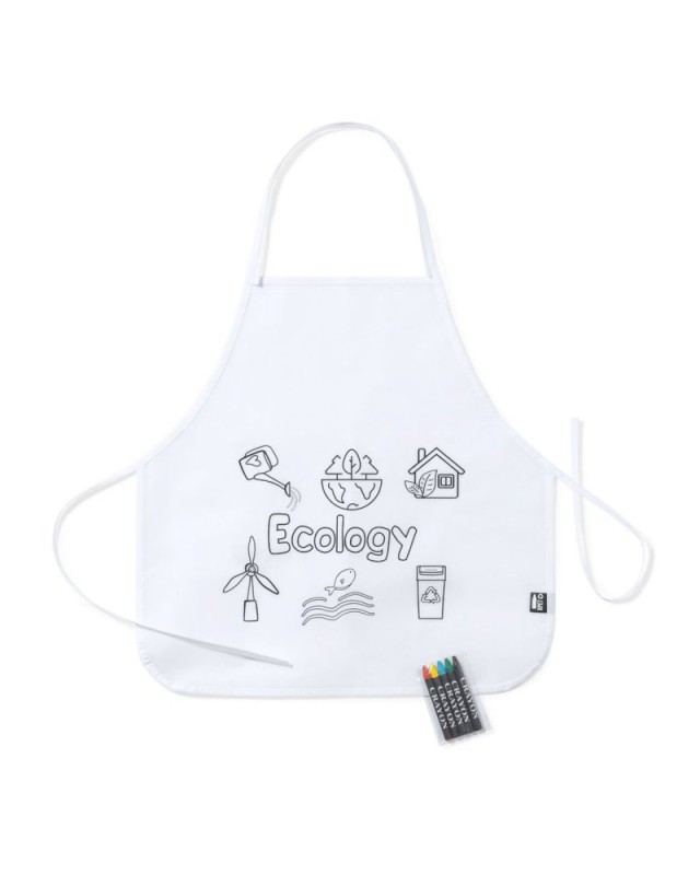 Grembiule in TNT RPET di colore bianco, appositamente studiato per colorare con i pastelli. Include 5 pastelli di diversi colori. Con cinghie di regolazione del collo e della vita. Distintivo RPET sulletichetta esterna.Il materiale RPET è realizzato con plastica riciclata, per promuovere il riutilizzo dei rifiuti plastici e contribuire alla sostenibilità del pianeta. - Lunghezza: 43 cm - Peso: 45 gr