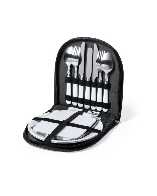 Originale set da picnic da 2 coperti. Presentato in una robusta custodia in RPET 600D, con chiusura a zip, maniglia per il trasporto ed etichetta esterna con logo RPET. Interno rinforzato con scomparti per diversi accessori. Contenuti: 2 cucchiai, 2 coltelli, 1 coltello da spalmare e 2 forchette in acciaio inox con manico in PP bianco.2 piatti bianchi in PP di 23 cm di diametro.2 tovaglioli di stoffa 29 x 29 cm. Con un design retrò a scacchiera e una combinazione di toni neri, grigi e bianchi.Tagliere di presentazione 15 x 15 cm, in PP bianco.Il materiale RPET della custodia è realizzato con plastica riciclata, per promuovere il riutilizzo dei rifiuti plastici e contribuire alla sostenibilità del pianeta. - Lunghezza: 24.5 cm - Larghezza: 4.5 cm - Peso: 675 gr