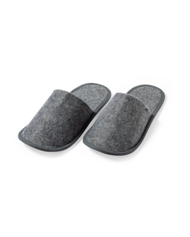 Coppia di pantofole unisex. Realizzato in resistente feltro RPET, frutto della combinazione del processo di riciclo delle materie plastiche con la millenaria tecnica di produzione del feltro, il risultato è un materiale di eco-tendenza che, oltre a essere riciclato, diventa anche riciclabile. Confortevoli interni imbottiti con cuciture rinforzate e in taglia unica 36-43. - Peso: 65 gr