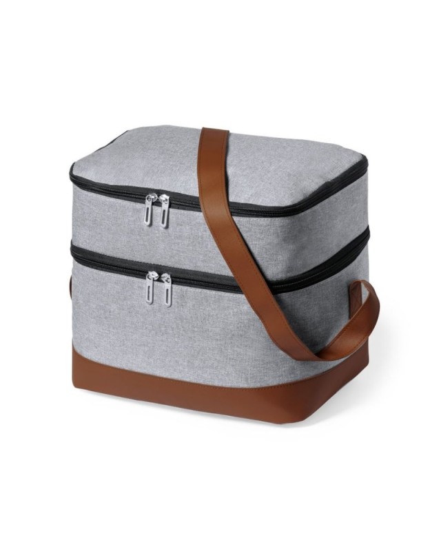 Borsa termica realizzata in resistente RPET 600D. Finitura grigia, base e tracolla in similpelle marrone. Comprende 2 scomparti indipendenti, con chiusura a zip e manici in metallo. Etichetta interna ed esterna isotermica in alluminio con logo RPET.Il materiale RPET è realizzato con plastica riciclata, per promuovere il riutilizzo dei rifiuti plastici e contribuire alla sostenibilità del pianeta. - Lunghezza: 30 cm - Larghezza: 20 cm - Peso: 305 gr