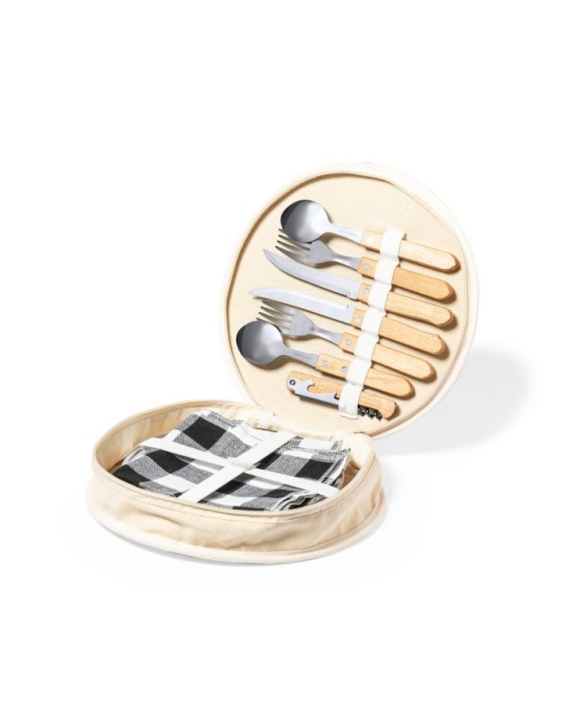 Originale set da picnic da 2 coperti. Presentato in una robusta borsa in 100% cotone con finitura naturale, chiusura a zip e maniglia per il trasporto. Interno rinforzato, con scomparti per diversi accessori. Contenuti: 2 cucchiai, 2 coltelli e 2 forchette in acciaio inox con manico in legno naturale. 2 piatti in acciaio inox di 19,5 cm di diametro. 2 tovaglioli di stoffa 30 x 30 cm. Con un design retrò a scacchiera e una combinazione di toni neri, grigi e bianchi. Cavatappi in acciaio inox con coltello integrato e manico in legno naturale. Tagliere 15 x 15 cm, in legno naturale e con manico fustellato. - Diametro: 26.5 cm - Peso: 750 gr