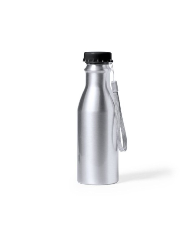 Borraccia da 500 ml, in alluminio con fintiura lucida. Tappo originale a vite nero e e cinghia per il trasporto. BPA free e confezionato singolarmente in una scatola kraft. - Diametro: 6.6 cm - Peso: 75 gr