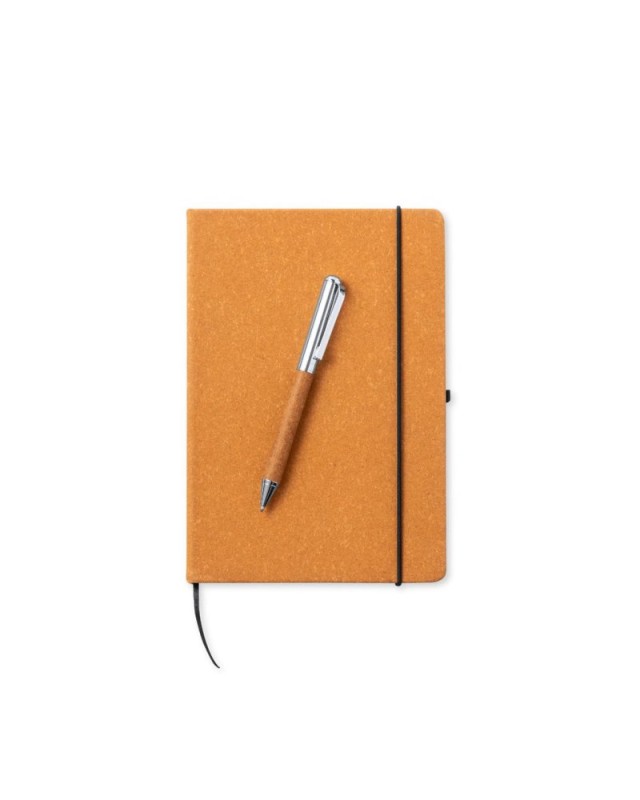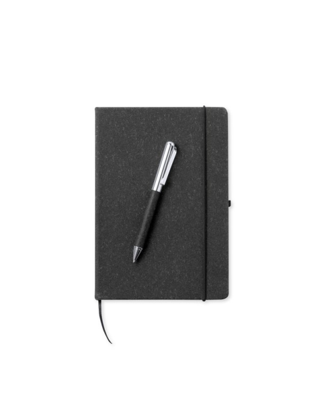 Set di block notes e penna in pelle riciclata. Include: Block notes con copertina rigida in pelle riciclata. Allinterno 100 fogli a righe singole. Include un segnalibro, una chiusura elastica e un portapenne coordinato. Con etichetta pelle riciclata sulla quarta di copertina.Penna in metallo cromato con fusto rivestito in pelle riciclata. Elegante clip in metallo e accessori coordinati. Meccanismo a rotazione e inchiostro blu, con etichetta pelle riciclata sul fusto.Set presentato in un astuccio individuale dal design kraft, con scomparto separato per blocco note e penna.La pelle riciclata recupera le fibre scartate nel processo di produzione della pelle, riducendo al minimo i rifiuti di materiale e contribuendo a ridurre limpatto ambientale, pur mantenendo le proprietà originali. - Lunghezza: 24 cm - Larghezza: 1.8 cm - Peso: 393 gr