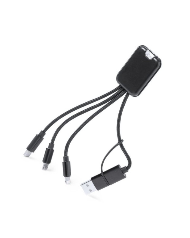 Cavo di ricarica luminoso con parte centrale appositamente progettata per la stampa laser per illuminare il logo. Con connessioni di ingresso Type-C e USB e uscite Type-C, Lightning e Micro USB. 5V DC 2,4A. In elegante finitura nera, con cavi rivestiti in tessuto di poliestere. - Lunghezza: 2.9 cm - Larghezza: 0.9 cm - Peso: 22 gr