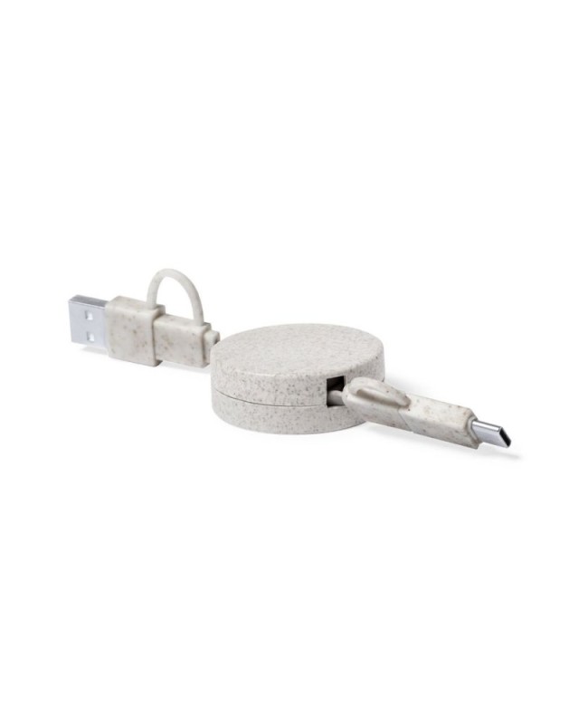 Cavo di ricarica e sincronizzazione estensibile, adatto alla ricarica dei dispositivi e al trasferimento dei dati. Realizzato in fibra di grano per promuovere luso di materie prime naturali e ridurre le emissioni inquinanti. Parte centrale con meccanismo interno estensibile. Include connessioni di ingresso Type-C e USB uscite Lightning, Micro USB e Type-C. 5V DC 2,4A. Presentato in un sacchetto kraft individuale. - Lunghezza: 80 cm - Larghezza: 1.5 cm - Peso: 26 gr