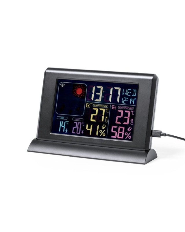 Stazione meteorologica multifunzione di qualità superiore, realizzata in ABS resistente con finitura nera satinata. Include un display retroilluminato di facile lettura con grafica a colori. Con sensore wireless di temperatura/umidità esterna e sensore integrato di temperatura/umidità interna. Funzioni di sveglia e calendario, con APP disponibile - compatibile con iOS/ Android - per il controllo remoto tramite rete WiFi e funzioni extra. Adattatore di alimentazione e cavo USB lungo 1 m inclusi, con staffa di montaggio a parete. Sensore esterno con alimentazione a batteria (2xAAA non inclusa). Confezionata singolarmente in una scatola kraft, con manuale di istruzioni in inglese e spagnolo. - Lunghezza: 18.1 cm - Larghezza: 2 cm - Peso: 240 gr
