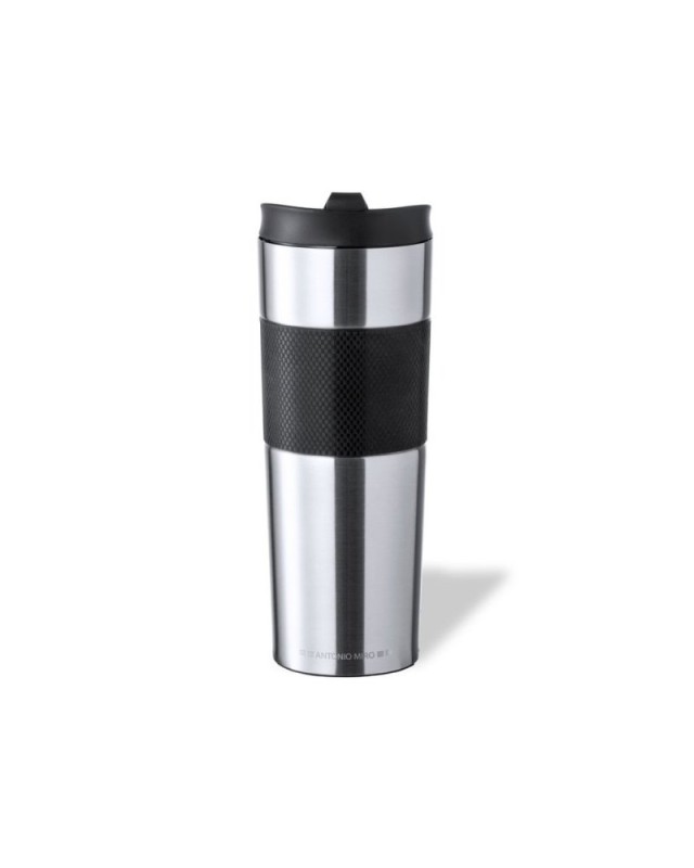 Bicchiere termico da tavolo by Antonio Miró. Realizzato in acciaio inox a doppia parete con capacità di 450 ml. È ideale per la tua scrivania, tavolo o qualsiasi superficie dove puoi goderti la tua bevanda preferita. Finitura opaca, con elegante striscia centrale e logo del marchio sul fondo. Coperchio di facile apertura e BPA Free. Confezionato singolarmente in unelegante scatola nera con logo Antonio Miró. - Diametro: 7.7 cm - Peso: 360 gr