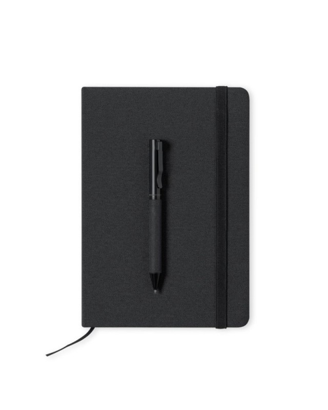 Set di block notes e penna di Antonio Miró. Include: Block notes con elegante finitura nera, realizzato in resistente poliestere 300D, con copertina rigida e chiusura elastica abbinata. Interno con 100 fogli dal layout a righe singole.Penna a rotazione in metallo con inchiostro blu. Con fusto e finiture nere, clip in metallo e logo del marchio.Il set è confezionato in unelegante e robusta scatola nera con logo Antonio Miró e custodia protettiva abbinata. - Lunghezza: 24 cm - Larghezza: 4 cm - Peso: 538 gr
