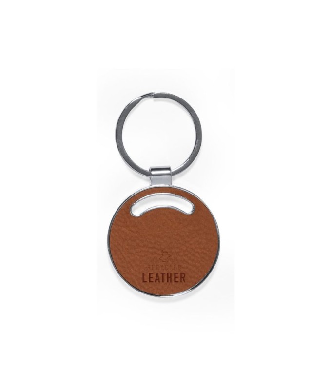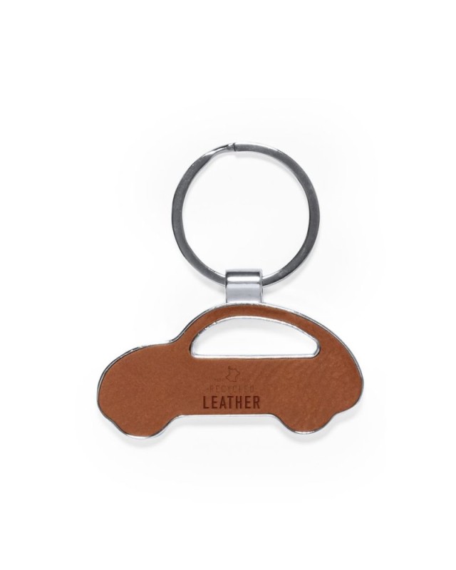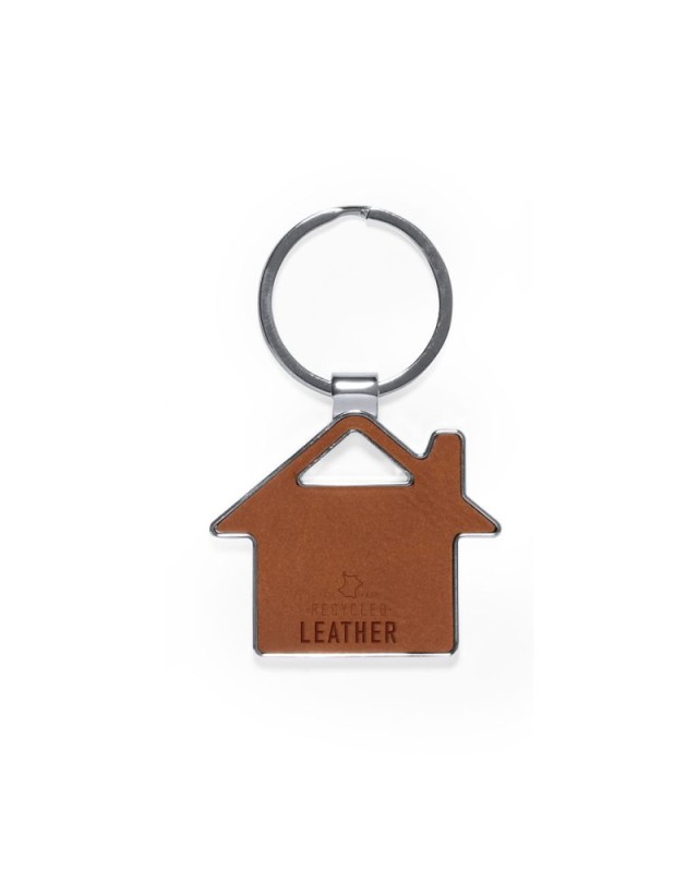 Portachiavi in pelle riciclata. In tonalità marrone, include badge pelle riciclata su un lato, con lato opposto liscio per la stampa e anello in metallo cromato. Disponibile in quattro design:A: CasaB: AutoC: CerchioD: RettangoloPresentati in un sacchetto individuale di cartone kraft riciclato.La pelle riciclata recupera le fibre scartate nel processo di produzione della pelle, riducendo al minimo i rifiuti di materiale e contribuendo a ridurre limpatto ambientale, pur mantenendo le proprietà originali - Peso: 30 gr
