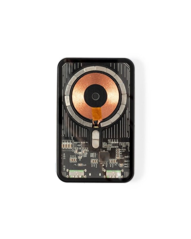 Power bank dal caratteristico design trasparente, con capacità di carica di 5.000 mAh. Caricatore wireless da 15W integrato e connettori di ingresso/uscita Type-C + uscita USB. Con attacco magnetico Magsafe, per una presa salda del dispositivo, compatibile con i dispositivi dotati di tecnologia di ricarica wireless Qi. Cavo di ricarica incluso e manuale di istruzioni disponibile in inglese e spagnolo. Imballato singolarmente con un design ecologico in cartone kraft. Ingresso/uscita Tipo C: 5-12V DC 3-1,67A, 20W Uscita USB: 5-12V DC 3-1,5A, 18W Le capacità indicate su tutte le nostre batterie ausiliarie esterne sono reali, incorporando tutte batterie di grado A e non riciclate, con una durata di almeno 500 cicli di carica e conformi alle normative CE. Inoltre, sono prodotte secondo gli standard RoHS e in conformità con i seguenti requisiti di sicurezza: Sistema di protezione da sovraccarico del power bank. Sistema di protezione dalla scarica completa per una maggiore durata del power bank. Sistema di blocco per prevenire i cortocircuiti. Sistema di trasferimento costante della carica, in base alla capacità del dispositivo di destinazione". - Lunghezza: 6.9 cm - Larghezza: 1.9 cm - Peso: 165 gr