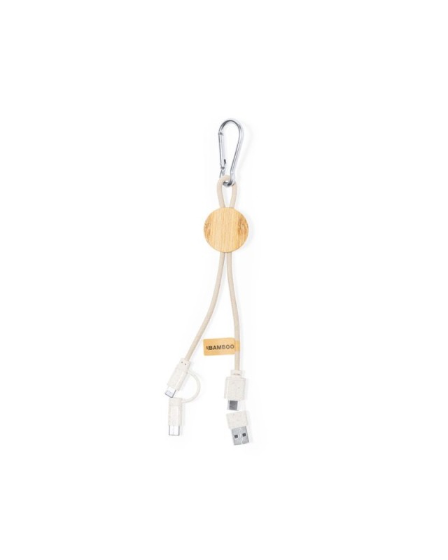 Cavo di ricarica con clip a moschettone. Realizzato con materiali naturali ed ecologici:Parte centrale in bambù naturale.Cavi rivestiti in cotone, con connessioni di ingresso USB e di tipo C, uscite Lightning, Micro USB e di tipo C. 5V DC 2,4A.Presentato in un sacchetto di design kraft individuale. Confezione che reca il caratteristico hangtag in bambù e cotone kraft.Realizzato con elementi di origine vegetale per incoraggiare luso di materie prime naturali e ridurre le emissioni inquinanti. - Lunghezza: 3.2 cm - Larghezza: 1 cm - Peso: 22 gr