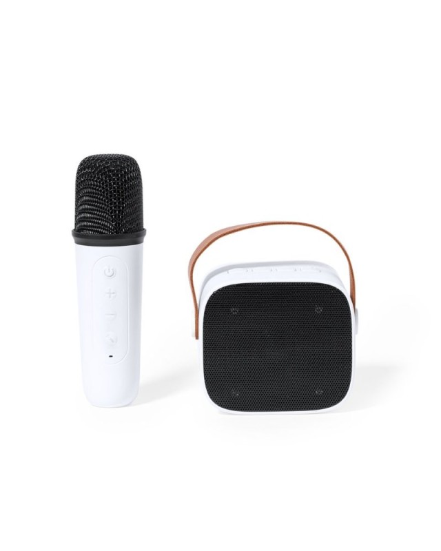Originale confezione karaoke con altoparlante e microfono. Le sue dimensioni compatte e la facile connessione Bluetooth lo rendono un accessorio ideale per divertirsi ovunque e in qualsiasi momento. Include: Altoparlante con comoda maniglia per il trasporto in PU. Potenza di 5W e batteria a lunga durata da 1200 mAh.Microfono con design ergonomico coordinato per ascoltare le migliori canzoni.Presentato in una scatola di design Kraft. Manuale di istruzioni disponibile in inglese e spagnolo. - Lunghezza: 13.5 cm - Larghezza: 7 cm - Peso: 414 gr