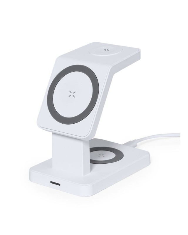 Caricatore multiplo wireless completo da 15W con supporto per gadget. Progettato per la ricarica simultanea di smartphone, cuffie e smartwatch: una stazione di ricarica all-in-one. Presentato in una scatola di design kraft. Manuale di istruzioni disponibile in inglese e spagnolo. - Lunghezza: 10.6 cm - Larghezza: 7.3 cm - Peso: 115 gr