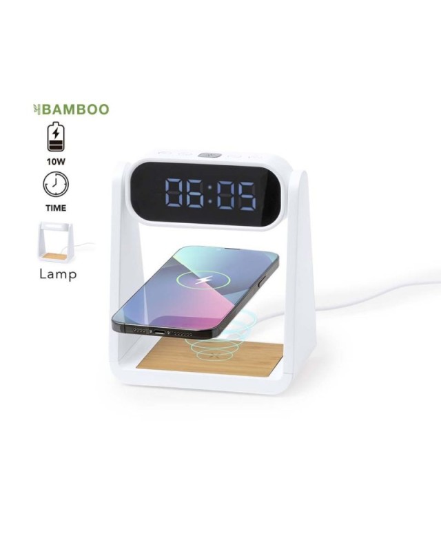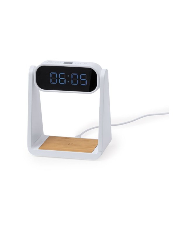 Orologio multifunzionale con display retroilluminato, funzione lampada e caricatore wireless integrato da 10W. Realizzato in resistente ABS e bambù, elegante design bianco, con funzioni di ora (12/24h) e sveglia (3). Display con intensità regolabile, compatibile con i dispositivi dotati di tecnologia di ricarica wireless Qi e lampada a 6 LED. Presentato in una scatola individuale dal design kraft con protezione in carta, con manuale di istruzioni in inglese e spagnolo.Realizzato con elementi vegetali per promuovere luso di materie prime naturali e ridurre le emissioni inquinanti. - Lunghezza: 13.6 cm - Larghezza: 7.9 cm - Peso: 248 gr