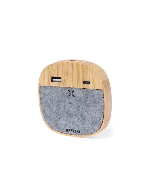 Caricatore wireless realizzato in bambù e feltro RPET. Funzione di ricarica di 15W e compatibile con i dispositivi dotati di tecnologia Qi. Include 2 uscite per la ricarica di più dispositivi: 1 uscita USB e 1 uscita Type-C. Con etichetta RPET. Ampia superficie di stampa, presentata in unattraente scatola kraft. Il feltro riciclato RPET è il risultato della combinazione del processo di riciclaggio delle materie plastiche con la tecnica millenaria di produzione del feltro, dando vita a un materiale di eco-tendenza che, oltre a essere di origine riciclata, diventa anche riciclabile. - Lunghezza: 9 cm - Larghezza: 9 cm - Peso: 69 gr