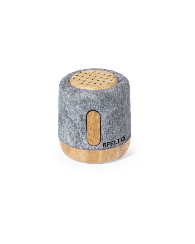 Altoparlante con connessione Bluetooth. Alloggiamento in bambù e feltro RPET. Con 3W di potenza, batteria da 300 mAh e connessione Bluetooth 5.0. Include cavo di ricarica di tipo C e manuale di istruzioni in inglese e spagnolo. Con logo RPET e presentato in una scatola kraft individuale.Il feltro riciclato RPET è il risultato della combinazione del processo di riciclaggio delle materie plastiche con la tecnica millenaria di produzione del feltro, dando vita a un materiale di eco-tendenza che, oltre a essere di origine riciclata, diventa anche riciclabile. - Diametro: 6 cm - Peso: 133 gr