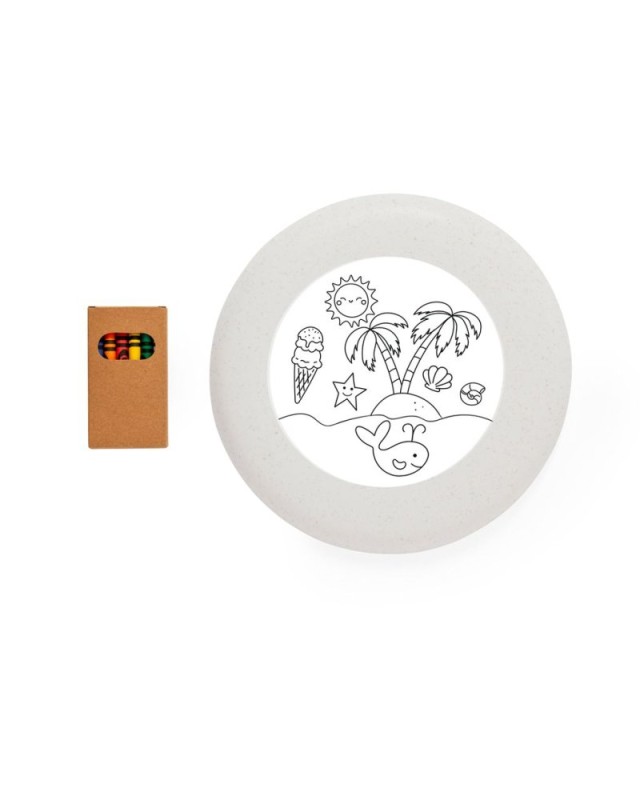 Originali frisbee personalizzabili realizzate in fibra di grano. Divertente set di pastelli e frisbee con unarea per colorare loriginale disegno della natura. Presentato in un sacchetto di carta riciclata. Include:Frisbee con disegno della natura da colorare.Scatola di 6 pastelli in una moltitudine di colori - Diametro: 23 cm - Peso: 105 gr