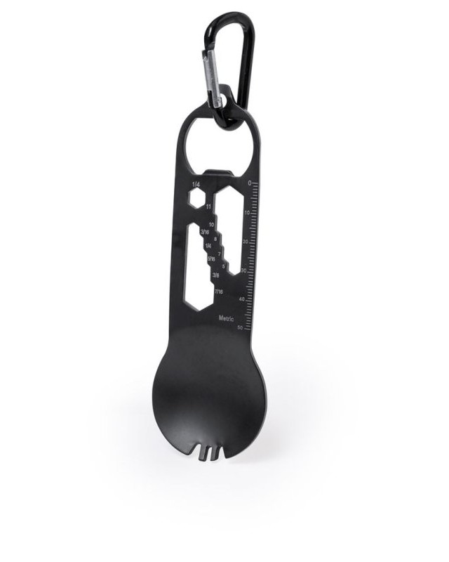 Multiutensile completo con 16 funzionalità in acciaio inox. Include: moschettone per un facile trasporto, area piatta per la funzione di cacciavite, apribottiglie, righello fino a 5 cm su un lato, parte centrale per dadi di 11 misure diverse (da 1/4 a 11) e pratico cucchiaio con denti da usare come forchetta. Presentato in un sacchetto individuale. - Lunghezza: 4.2 cm - Larghezza: 0.9 cm - Peso: 57 gr