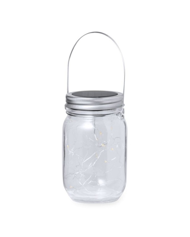Originale lampada solare a barattolo, realizzata in resistente materiale di vetro e con una striscia interna decorativa di 20 LED. Include un coperchio a vite in metallo con mini-pannello solare ricaricabile integrato e una batteria ricaricabile da 300 mAh. Con pratico manico per il trasporto o per appenderla e presentata in una scatola di design kraft individuale. - Diametro: 7.8 cm - Peso: 300 gr