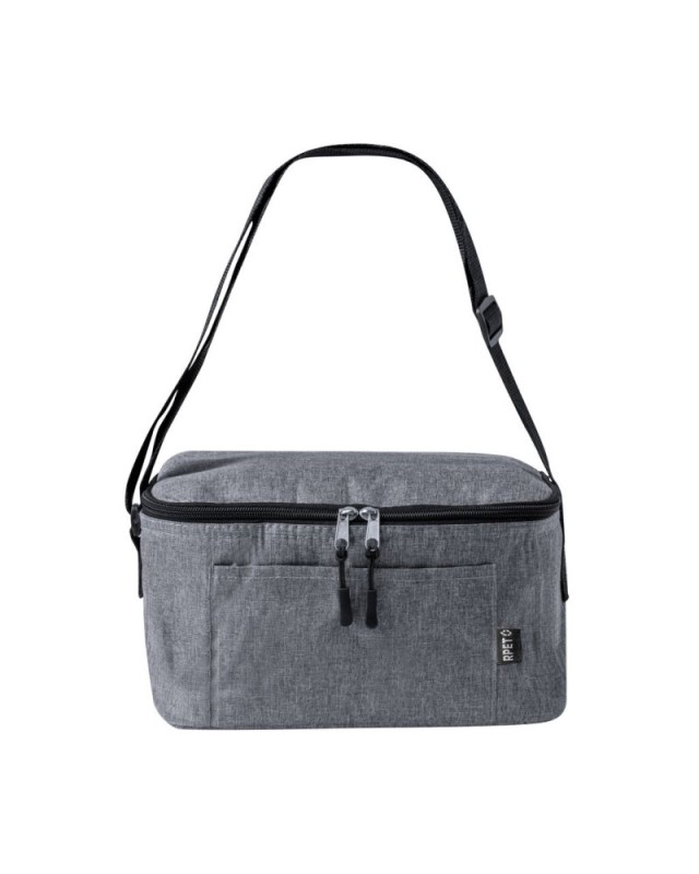 Borsa termica realizzata in resistente poliestere 600D RPET con un attraente effetto melange. Lo scomparto principale è dotato di chiusura a zip e fodera in alluminio. Dispone inoltre di una pratica tasca esterna e di una tracolla regolabile, che evidenzia il logo RPET sulletichetta esterna. Include un cestino per il pranzo con due scomparti da 700 ml e posate in PP riciclato nero. Confezionato singolarmente in un sacchetto riciclato.Il materiale RPET è realizzato con plastica riciclata per incoraggiare il riutilizzo dei rifiuti plastici e contribuire alla sostenibilità del pianeta. - Lunghezza: 25 cm - Larghezza: 15 cm - Peso: 144 gr