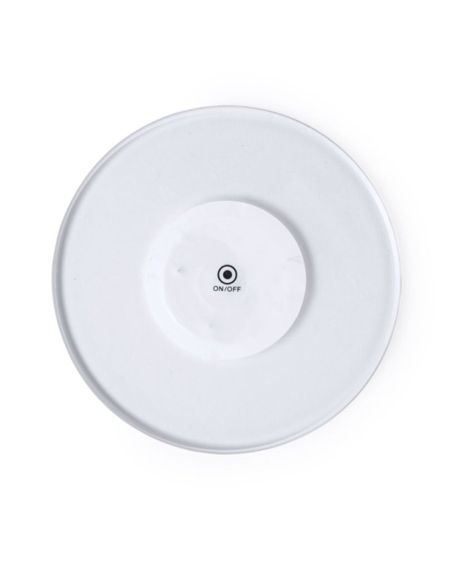 Originale sottobicchiere con 6 LED per illuminare le bevande. Con pulsante sulla base e 3 posizioni di illuminazione (luce fissa e luce lampeggiante veloce o lenta). Si attacca alla base di qualsiasi bevanda con un nastro autoadesivo ed è alimentato da due batterie a bottone (incluse). - Diametro: 10 cm - Peso: 30 gr
