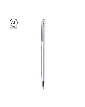 Pennarello con fusto in Alluminio Riciclato. Clip in metallo e finiture cromate. Meccanismo a rotazione e inchiostro blu. Con logo Alluminio Riciclato.LAlluminio Riciclato è un materiale con possibilità di riciclaggio quasi infinite, senza perdere le sue proprietà originali e consumando meno energia nel processo.Certificazione GRS (Global Recycled Standard), che garantisce lorigine riciclata del materiale utilizzato per la fabbricazione del prodotto. - Diametro: 0.8 cm - Peso: 10 gr