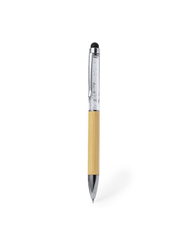 Elegante penna touch in bambù. Struttura in bambù con capsula trasparente che ospita cristalli a forma di diamante. Questa elegante penna è dotata di pennino touch sulla parte superiore, una clip ed elementi decorativi in metallo. Con meccanismo a rotazione e inchiostro blu. Materiali come il bambù favoriscono lutilizzo di materie prime naturali, riducendo le emissioni inquinanti. Proviene da una pianta altamente resistente e versatile, con una rapida crescita e rigenerazione, che lo rende unottima alternativa alluso del legno tradizionale. - Diametro: 1 cm - Peso: 11 gr