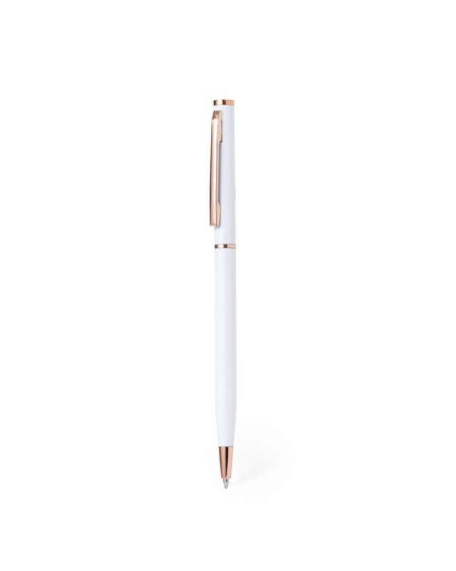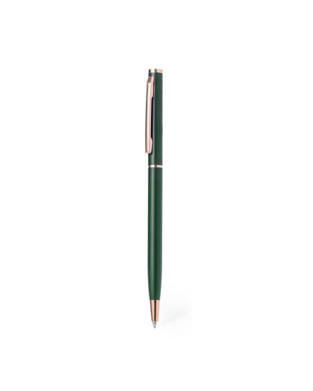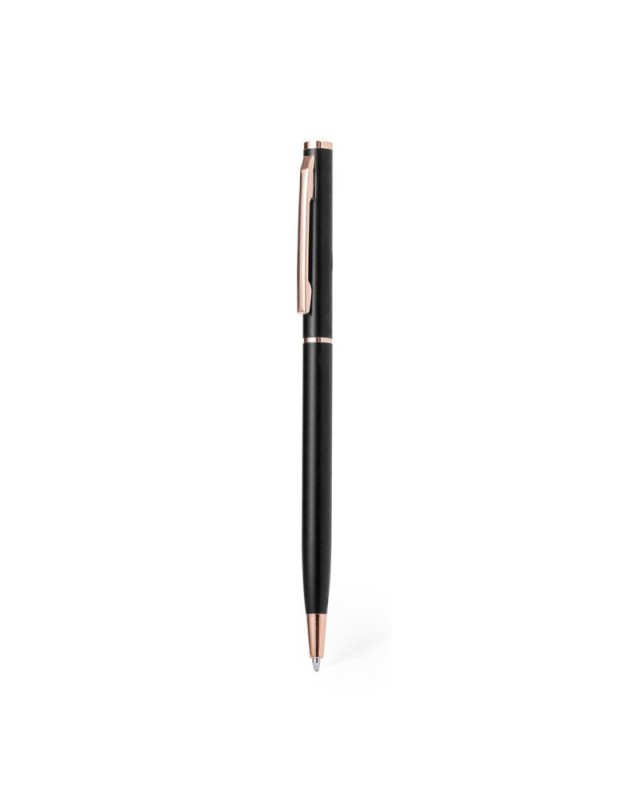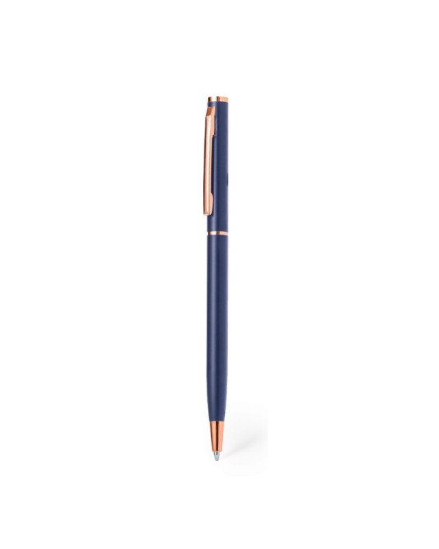 Eccezionale penna in alluminio con meccanismo a rotazione. Robusto fusto in alluminio opaco con elementi decorativi in elegante finitura color rame, con fusto in unampia gamma di colori esclusivi. Clip in metallo e inchiostro blu. Presentate in un astuccio individuale riciclato. - Diametro: 0.8 cm - Peso: 10 gr