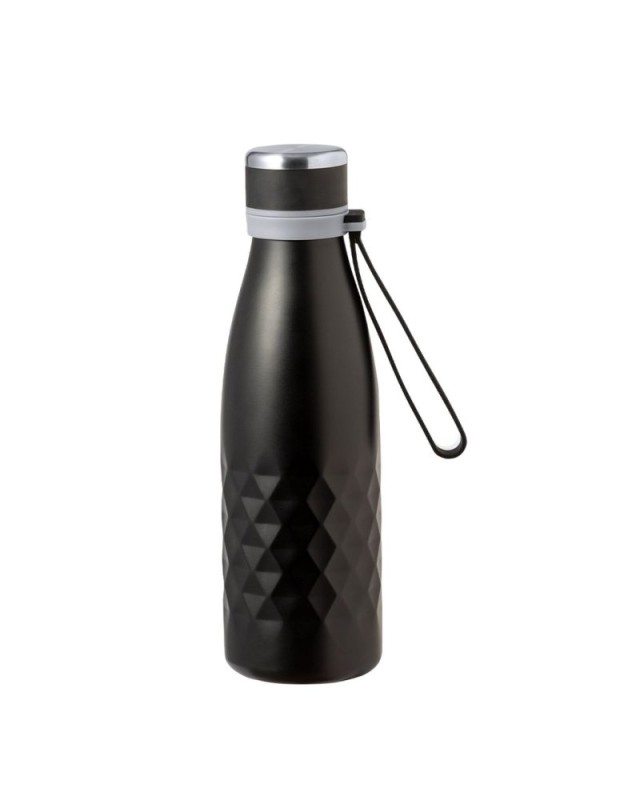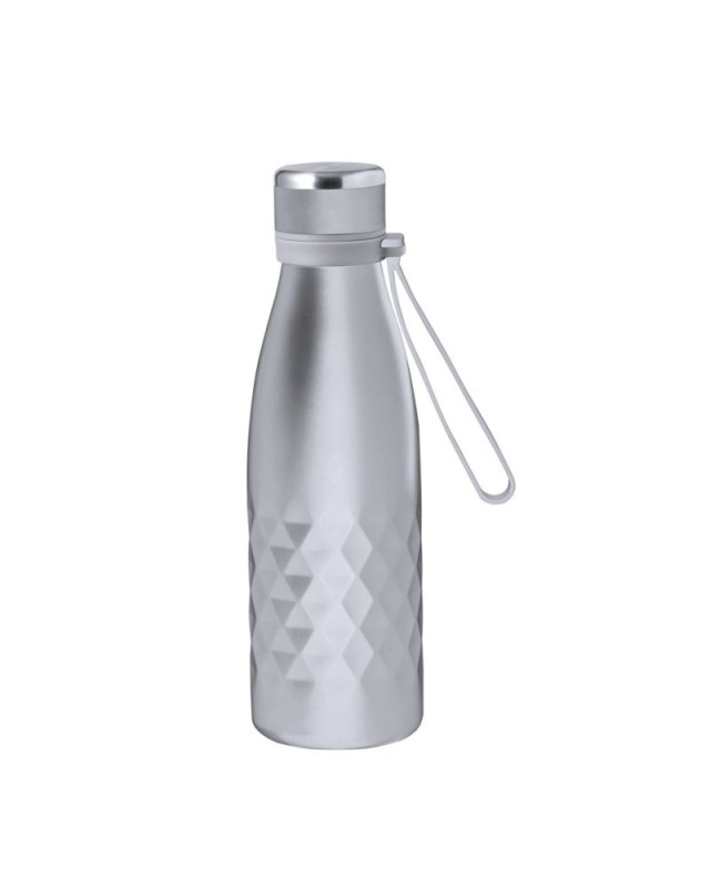 Elegante borraccia termica da 550 ml in acciaio inox a doppia parete con tappo a vite per una tenuta ottimale. Viene fornita con un comodo manico coordinato in gradevole silicone. Disponibile in una gamma di colori metallizzati, con un elegante motivo a rombi intorno al corpo. Presentata in una scatola di design kraft individuale. - Diametro: 7.3 cm - Peso: 280 gr