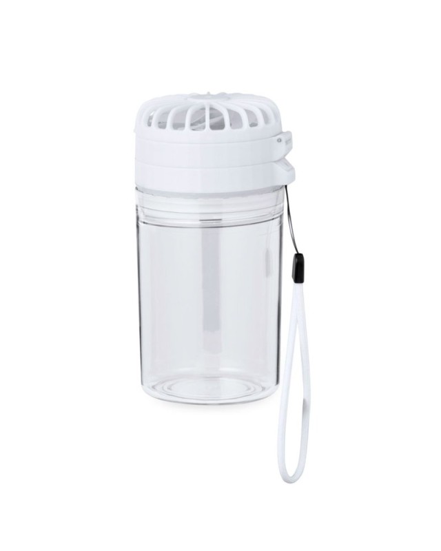 Pratica borraccia con ventilatore, realizzata in Tritan e con una capacità di 350 ml. Senza BPA, con coperchio a vite ermetico che include un ventilatore regolabile in 3 livelli di intensità e posizione. Con batteria da 1200 mAh e un coperchio extra per uso separato. Include un cordino per facilitarne il trasporto ed è confezionato singolarmente in una scatola kraft. - Diametro: 8.5 cm - Peso: 275 gr