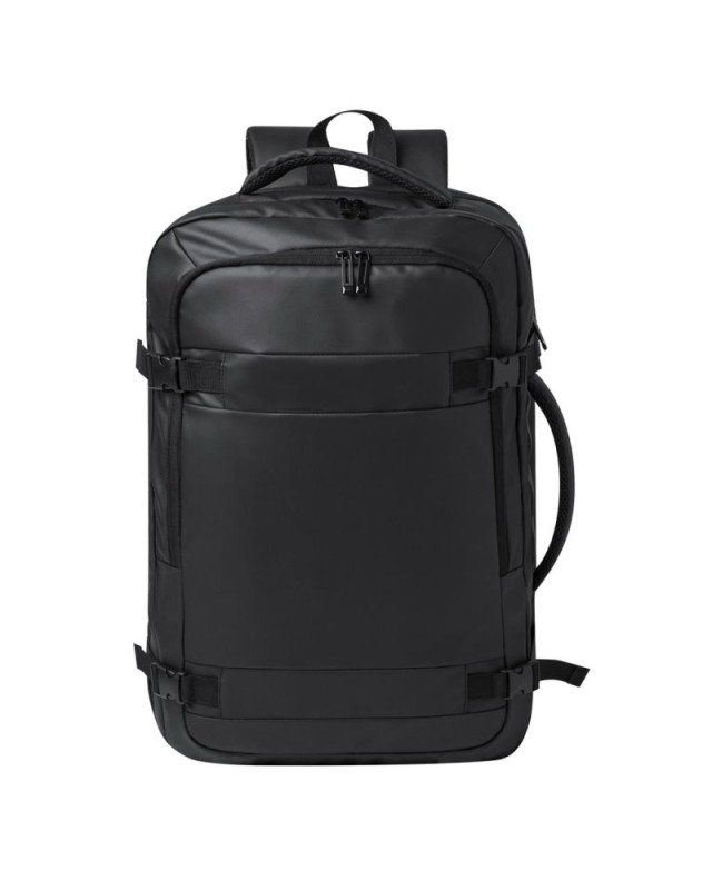 Zaino portadocumenti realizzato in elegante ecopelle verniciata. Caratterizzato da un design urbano con una tasca imbottita per laptop fino a 17 pollici. Rinforzato con cinghie laterali, ha una chiusura con fibbia di sicurezza e scomparti con chiusura a zip a doppio cursore. Gli spallacci e la schiena sono imbottiti e regolabili. Dispone inoltre di una cinghia per il trasporto su trolley e di una maniglia imbottita per un maggiore comfort quando viene utilizzata come portadocumenti. Confezionato singolarmente in un sacchetto riciclato. - Lunghezza: 33 cm - Larghezza: 16 cm - Peso: 800 gr