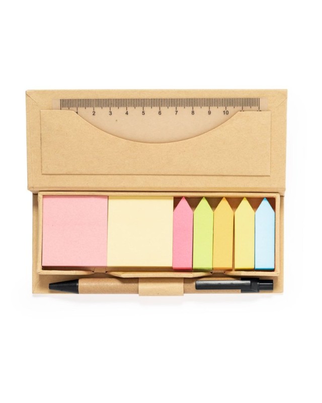 Pratico set da ufficio in cartone riciclato. Facile da trasportare grazie alla custodia in cartone riciclato. Contenuto: 110 post-it adesivi 5x5cm in due colori. 110 mini post-it a forma di freccia 1,5x5 cm in 5 colori vivaci. Righello da 12 cmPenna in cartone riciclato con inchiostro blu. Il set è presentato in un sacchetto individuale di carta riciclata. Il cartone riciclato proviene dal riutilizzo delle eccedenze di produzione e dal riciclo della carta al termine della sua vita utile, rendendolo una tela ecologica e sostenibile. - Lunghezza: 16 cm - Larghezza: 6.5 cm - Peso: 105 gr