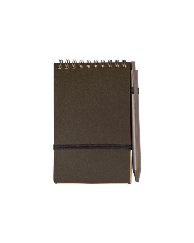 Set di taccuino e penna in fibra di caffè. Quaderno a doppio anello con copertina morbida, chiusura elastica e portapenne. Con 70 pagine e layout a righe singole. Meccanismo a pulsante con inchiostro blu. Include il logo Fibra di Caffè stampato sul taccuino e sulla penna. Presentato in una busta individuale riciclata.La fibra di caffè è ricavata dagli scarti della produzione del caffè. Unalternativa sostenibile che aiuta a ridurre luso della plastica, risparmiando energia nel processo di produzione e promuovendo così la cura dellambiente. - Lunghezza: 9.9 cm - Larghezza: 1.2 cm - Peso: 78 gr