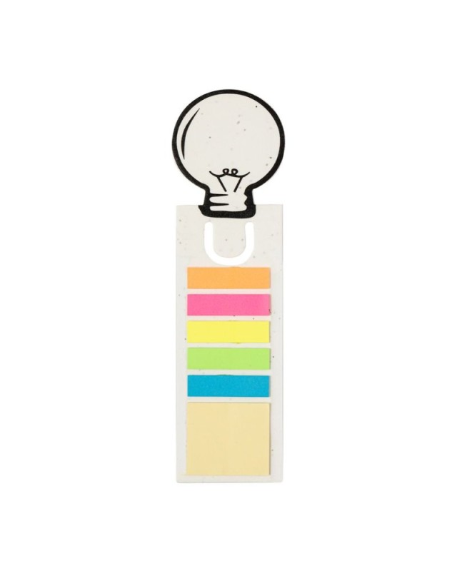 Originale segnalibro in carta di semi, con il caratteristico disegno di una lampadina sulla parte superiore. Dispone inoltre di post-it adesivi di varie forme e colori: 15 post-it 4x4,5 cm in giallo e 75 mini post-it 1,2x4,5 cm in cinque colori diversi. La carta include semi di petunia, che la rendono piantabile alla fine del suo ciclo di vita. Include istruzioni per la semina sul retro della copertina e viene fornito in un sacchetto individuale di carta riciclata. - Lunghezza: 6 cm - Peso: 10 gr